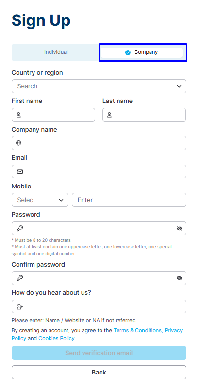Company users can select "Company" during the registration process and provide the required company information. Once completed, proceed with email activation to finalize the registration and account activation process.